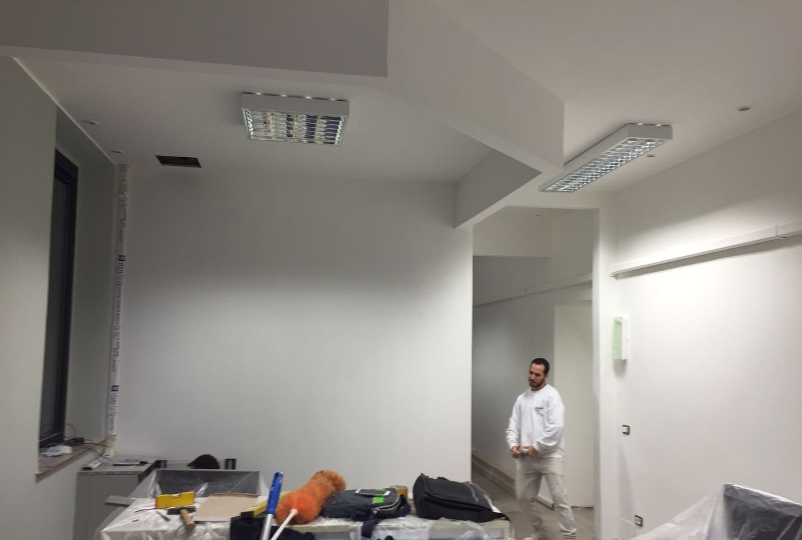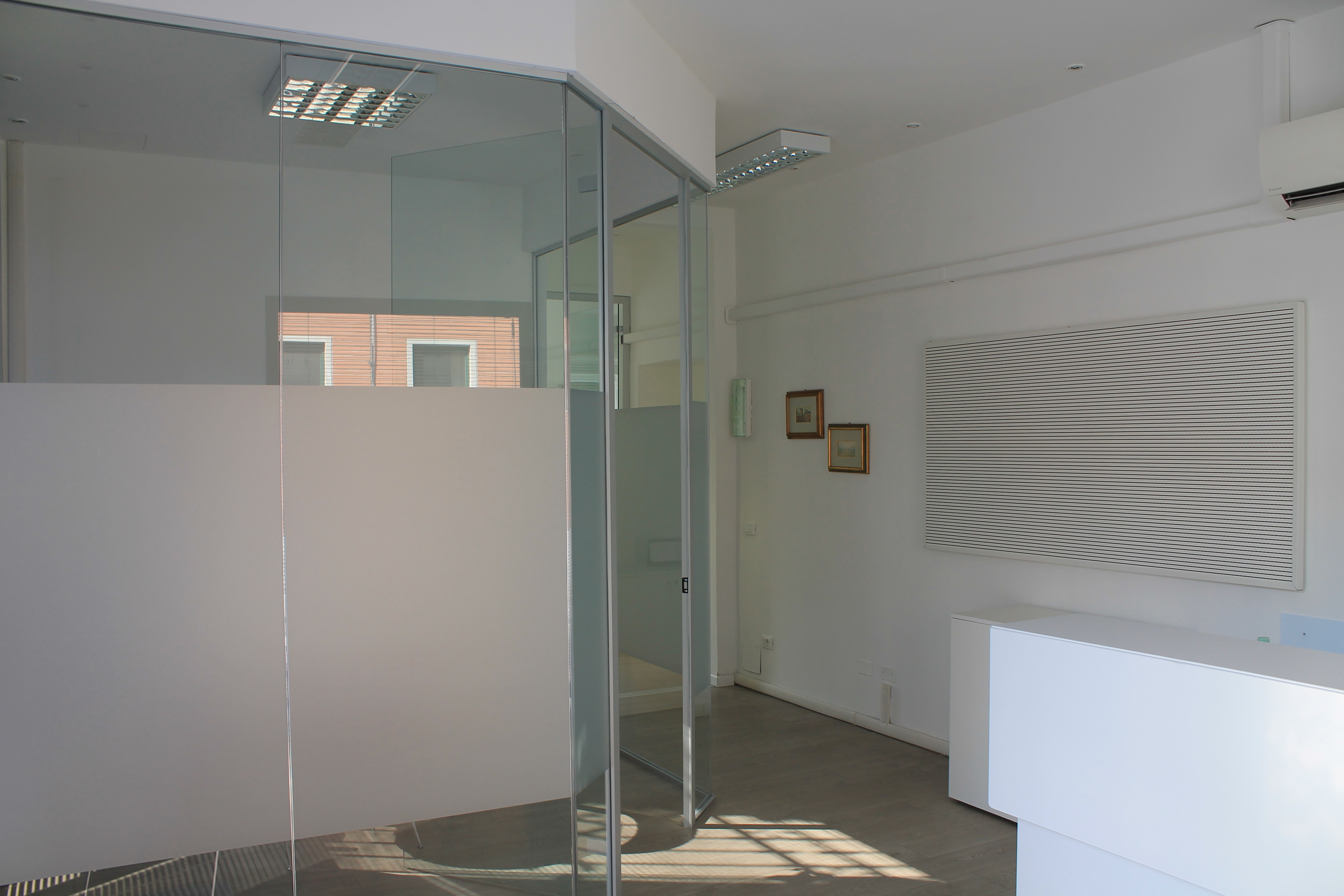 Restyling di immobile ad uso direzionale di 120 mq. Ridistribuzione dei locali interni mediante inserimento di velette in cartongesso e pareti vetrate, tinteggiatura e posa pavimento in modalità flottante.